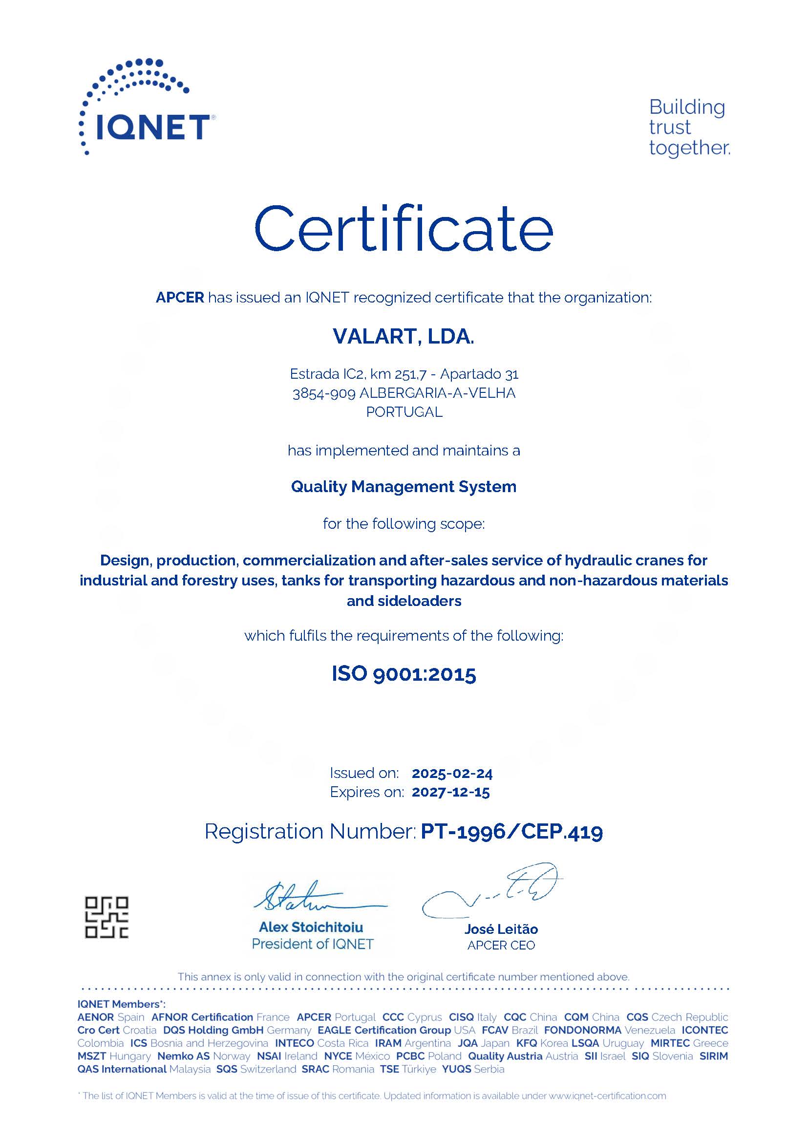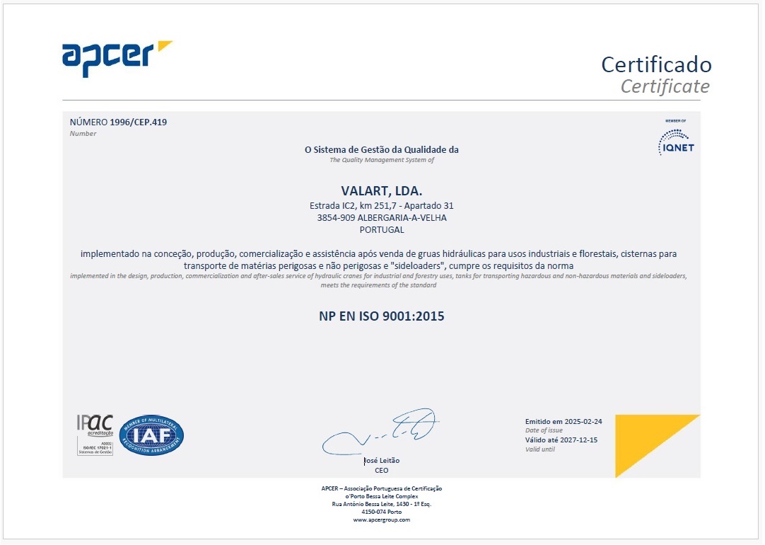 Valart é uma empresa certificada, com um Sistema de Gestão da Qualidade projetado e implementado de acordo com a NP EN ISO 9001:2015.