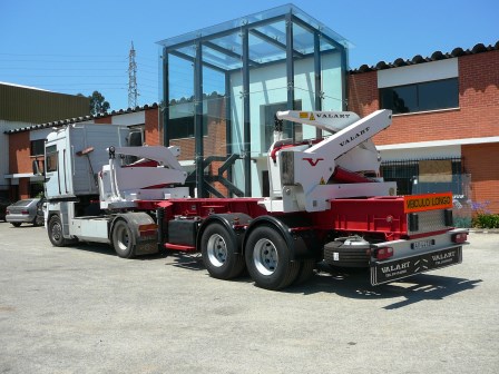 Sideloader para contentores de 20-45`, para comprimento 13,60 metros (máx.), ou 7,50 metros (mínimo ideal para ruas difíceis), porque tem um chassi articulado excepcional, com duas partes extensas.